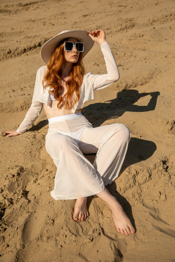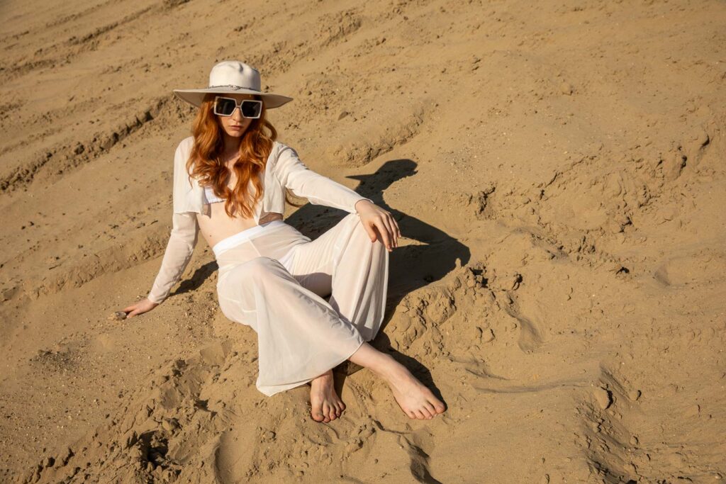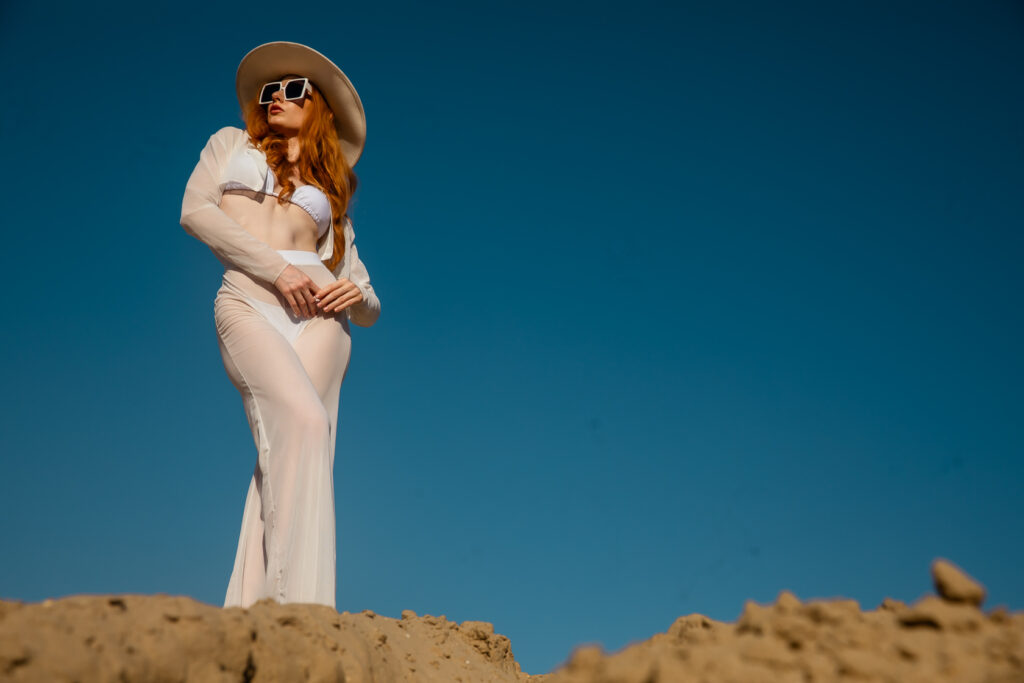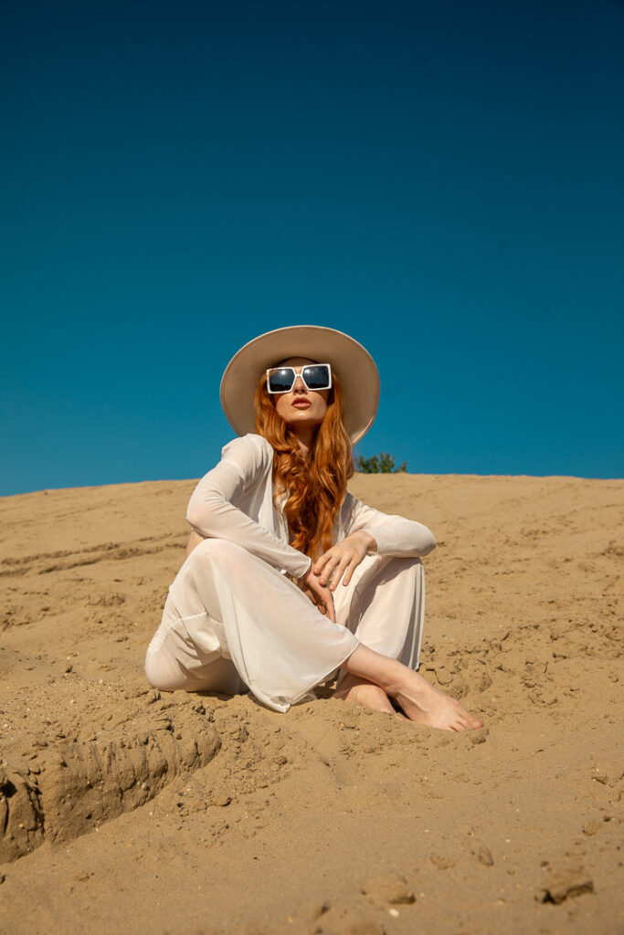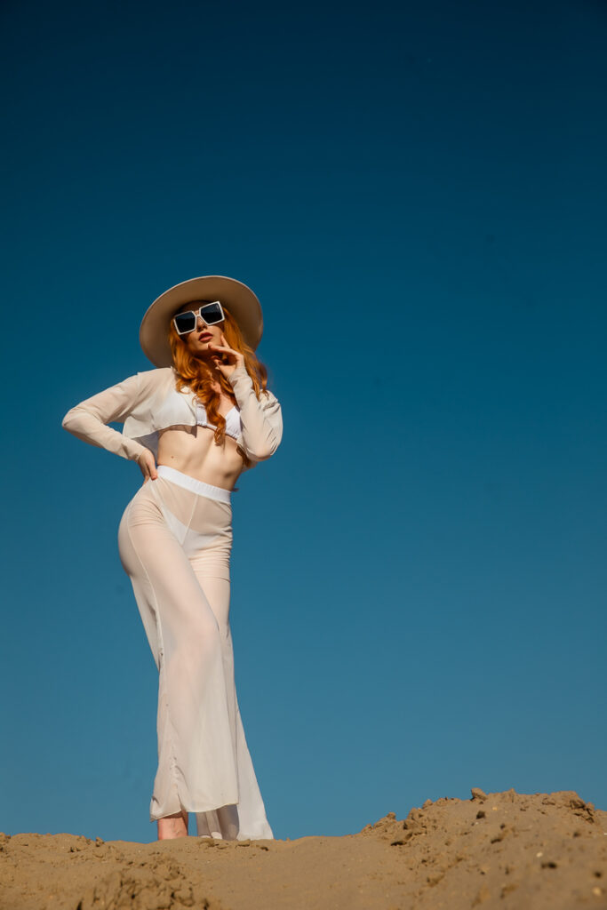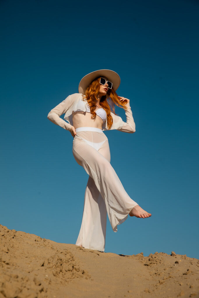Color Tones: Neutral whites against warm sand tones for high tonal separation. Deep blue sky used as a clean, contrasting backdrop.